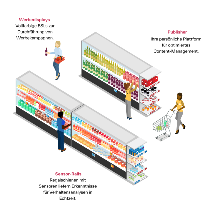 Treten Sie mit den Kunden über digitale Inhalte in Kontakt, die pünktlich und automatisch am Regal bereitgestellt werden.