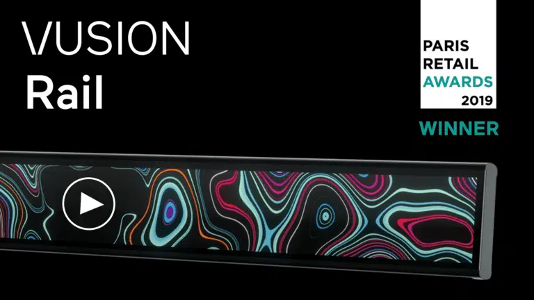 With a very high resolution LCD screen connected to the Cloud on the VUSION platform developed by SES-imagotag, the VUSION Rail synchronizes marketing campaigns (web to store) in real-time and easily display video content for brands and retailers.